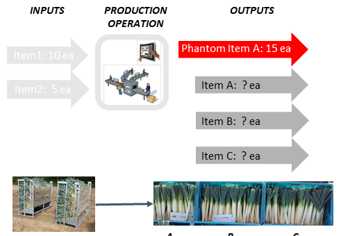 When the composition of the phantom item is not known in advance, it is possible to work with variants (for example: operation subdivides inputs in different qualities, it is not known in advance how much will be of which quality, not all items need to be produced).